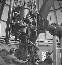 It was ordered from Grubb Parsons in 1931 by the Royal Observatory, Greenwich, and installed in a new dome building there.[3] With a reflecting mirror 36 inches wide (91 cm) and a focal length of 4.57 meters (15 ft), it was the largest telescope in use at the Observatory in Greenwich until the late 1950s.[2] Instruments for the Yapp reflector included two spectrographs, but also had an option for an eyepiece.[1] It was overall a Cassegrain reflecting design on an equatorial mounting, and it had a 6-inch guide telescope also.[3] One of the spectrographs was made by Adam Hilger, Ltd, and was delivered in 1937.[1]