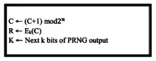 Yarrow-160 uses three-key Triple DES in counter mode to generate outputs. C is an n-bit counter value; K is the key. In order to generate the next output block, Yarrow follows the functions shown here.