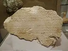 Surveys and excavations undertaken at Yavne-Yam during the 1950s and 1960s have revealed the existence of a large fortified site, consisting of a square enclosure with freestanding ramparts and marked by fortified gates, dating from the Middle and Late Bronze Age, during the second millennium BCE.[5] This has also been confirmed by underwater surveys undertaken in the harbor, which have uncovered pottery characteristic of the period.[4] Yavne-Yam may be the coastal city of Muḫḫazu (mHz) mentioned in the Amarna letters,[6][7] a name reminiscent of the Aramaic word for port.[8] It was inhabited during the late Iron Age, as testified by the Egyptian pottery and scarabs found at the site, as well as the discovery of Eastern Greek Pottery and several Hebrew-inscribed ostraca in nearby Mesad Hashavyahu. During the late 7th century BCE, the region apparently passed from Egyptian to Judean control, and was populated by Israelites, Canaanites, Phoenicians and perhaps even Greeks.[5]