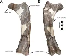 The robustly shafted femur is straightened and minimally curved as in Avaceratops,[5] although part of this may be an artifact of crushing. On the femur, the femoral head is rounded and globe-shaped, the greater trochanter is separated from and rises above the level of the femoral head, and the fourth trochanter forms a prominent crest like in other centrosaurines. The cnemial crest of the tibia is expanded and is about 40% of the width of the expanded end of the bone, which is similar to Avaceratops.[5][4][2]