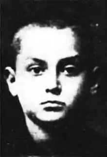 Yitskhok Rudashevski (10 December 1927, Vilnius – 1 October 1943) was a young Jewish teenager who lived in the Vilna Ghetto in Lithuania during the 1940s. He wrote a diary from June 1941 to April 1943 which detailed his life and struggles living in the ghetto. He was shot to death in the Ponary massacre during the liquidation of September–October 1943.[1] His diary was discovered by his cousin Sore Voloshin, in 1944. His cousin Voloshin fought the German army and the Soviet Union, later returning to the hideout, and found Yitskhok's diary.