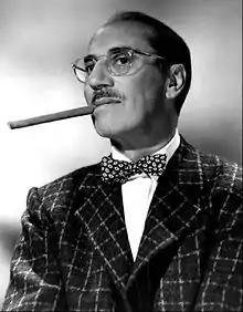 You Bet Your Life is an American comedy quiz series that has aired on both radio[1] and television.[2] The original version was hosted by Groucho Marx of the Marx Brothers, with announcer and assistant George Fenneman. The show debuted on ABC Radio on October 27, 1947, moved to CBS Radio debuting October 5, 1949, and went to NBC-TV and NBC Radio on October 4, 1950. Because of its simple format, it was possible to broadcast the show on both radio[1] and television but not simultaneously. Many of the laughs on the television show were evoked by Groucho's facial reactions and other visual gimmicks; the two versions were slightly different. The last episode in a radio format aired on June 10, 1960. The series continued on television for another year, recording a season on September 22, 1960 with a new title, The Groucho Show.