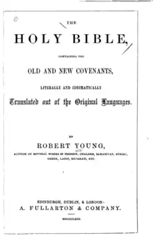 Young's Literal Translation (YLT) is a translation of the Bible into English, published in 1862. The translation was made by Robert Young, compiler of Young's Analytical Concordance to the Bible and Concise Critical Comments on the New Testament. Young used the Textus Receptus (TR) and the Masoretic Text (MT) as the basis for his translation. He wrote in the preface to the first edition, "It has been no part of the Translator's plan to attempt to form a New Hebrew or Greek Text—he has therefore somewhat rigidly adhered to the received ones."[1] Young produced a "Revised Version" of his translation in 1887, but he stuck with the Received Text. He wrote in the preface to the Revised Edition, "The Greek Text followed is that generally recognized as the 'Received Text,' not because it is thought perfect, but because the department of Translation is quite distinct from that of textual criticism, and few are qualified for both. If the original text be altered by a translator, (except he give his reasons for and against each emendation,) the reader is left in uncertainty whether the translation given is to be considered as that of the old or of the new reading."[1] A new Revised Edition was released ten years after Robert Young's death on October 14, 1888. The 1898 version was based on the TR, easily confirmed by the word "bathe" in Revelation 1:5 and the word "again" in Revelation 20:5. The "Publishers' Note to the Third Edition" explains, "The work has been subjected to a fresh revision, making no alteration on the principles on which the Translation proceeds, but endeavouring to make it as nearly perfect in point of accuracy on its present lines as possible."[1]
