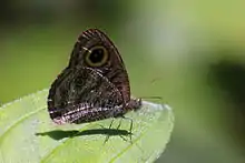 Males and females: Upperside very similar to the above, paler; in the female often the ground colour ochraceous white, closely irrorated with brown striae; ocelli as in the wet-season form, but those on the hindwing often non-pupilled. Underside also paler than in the wet-season form, the subbasal, discal and subterminal bands on the whole more prominent; ocelli on the hindwing reduced to mere specks.[3][4]