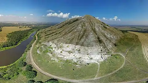 Has a conical shape. Slopes - 20-30 degrees, but do not form rocky ledges. The lower part is covered with scree. At the base of the northern slope of the mountain are springs, one of which is sulphurous.