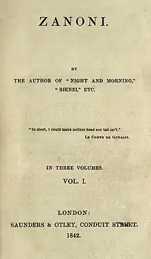 Zanoni is an 1842 novel by Edward Bulwer-Lytton, a story of love and occult aspiration. By way of introduction, the author confesses: "... It so chanced that some years ago, in my younger days, whether of authorship or life, I felt the desire to make myself acquainted with the true origins and tenets of the singular sect known by the name of Rosicrucians." A manuscript came into his hands written in the most unintelligible cipher, a manuscript which through the author's own interpretation became Zanoni.[1]