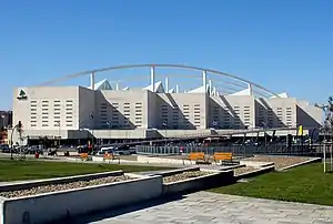 Zaragoza–Delicias station is a railway station located in the city of Zaragoza in Aragon, Spain. The station opened on 7 May 2003, and the Central Bus Station Zaragoza opened on 5 May 2007, providing a wide intermodality to passengers. It is served by the AVE high-speed trains between Madrid and Barcelona and onwards to Figueres.