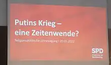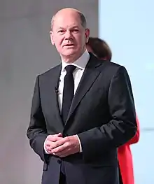 On 27 February, Scholz addressed the Bundestag, Germany's lower house of parliament, to outline his government's reaction to Russia's invasion of Ukraine. He announced a fundamental restructuring of the country's cautious defence policy: Scholz vowed to set up an extraordinary fund of €100 billion to be invested in the modernisation of the German armed forces, the Bundeswehr.[4] He also promised that defence spending would exceed 2% of gross domestic product (GDP), a requirement of NATO membership that Scholz's Social Democratic Party of Germany (SPD) had traditionally opposed.[4] Scholz justified his departure from established defence policy with the threat posed by Russia to peace in Europe. He described the new political situation on the continent as a "historic turning point" German: Zeitenwende, literally: times-turn),[5] saying: