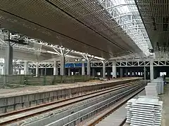 The station covers an area of 219.07 hectares and has a floor area of 350,000 square meters. Costing RMB 4 billion, it consists of 30 platforms (2 side platforms and 14 island platforms) and 32 tracks. Platforms 1-16 are designated for the Beijing–Guangzhou–Shenzhen–Hong Kong high-speed railway and platforms 21-30 designated for the Xuzhou–Lanzhou High-Speed Railway. Platforms 17-20 are for intercity trains.