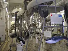 In the front hall of the museum is a monument to Karl Ernst von Baer by the entrance, as well as skeletons of cetaceans, including the enormous 27-metre-long (89 ft) blue whale, and mounted pinnipeds. In the gallery above the front hall, the entomological collection is displayed. The second and third halls form a long passage with systematic collections and dioramas dating back to the early 20th century. The second hall hosts the collection of fishes, amphibians, reptiles, birds and invertebrates, mounted or preserved in formalin, and their skeletons or shells. The collection of mammals, including woolly mammoths, is displayed in the third hall.