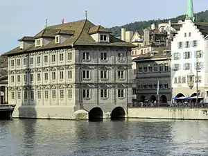 The current building is situated on the Limmat River's right bank in the immediate neighborhood of the Grossmünster church, the Rathaus, Zürich, and the Haus Zum Rüden. The building exhibits typical architectural features from its era such as its facade, which includes cornices and columns.[5] In the mid-19th-century, the building was also used as an improvised post office.[6]