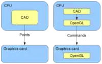 OpenGL significantly improves the quality and speed of 3D model visualization, allowing the separate Graphics Processing Unit (GPU) to handle graphics rendering and freeing up Central Processing Unit (CPU) capacity, which improves CAD performance and usability. OpenGL interface offers many ready to use functions that speed up CAD development. OpenGL is supported by OS (operating system) such as Windows or Unix. CAD so first call OS function, which is performed by OS or propagated to GPU using driver. Functions and complex calculation are so preferably done by fast and optimized GPU or, if required function is not supported by graphics card GPU, then software emulation is used and calculation is done by CPU. Modern graphic cards are in fact powerful computers that process commands. That is why they are expensive and power hungry. You should be aware of GPU role while it can dramatically improve CAD performance. When using particular CAD, graphics card features (especially supported standards) should be in concordance.