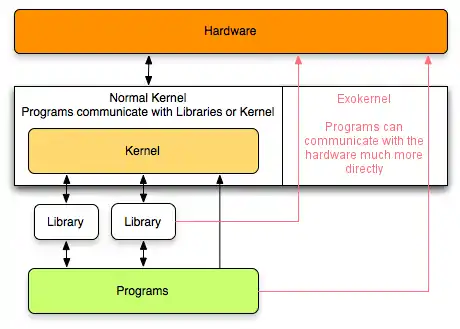 The KernelWhat's a Kernel?The kernel is one of the most important parts of an operating system. The kernel creates an abstraction layer between the computer's hardware and the program(s) that are running. This means that the kernel takes care of a lot of things from handling interrupts to managing the graphics on the computer monitor. The kernel is one of the most critical parts of an kernel and as a result, a small bug within the kernel can cause the entire kernel to crash. Kernels can differ from other kernels since there is several ways to design a kernel, each with their advantages and disadvantages. The two main kernels that you'll learn about in this lesson are the monolithic kernel and the microkernel. The Monolithic KernelThe monolithic kernel is a kernel design that runs all of the operating system's programs inside the kernel space. This approach basically makes the kernel handle all of operating system's jobs like I/O, device drivers, and the file system. This creates a layer of abstraction for programmers, since the kernel handles and works with the hardware. Because the operating system is ran entirely inside of the kernel space, a small bug can cause the entire operating system to crash. You should note that you do not need to keep all of the operating system jobs within the kernel, you could slice them up into system files and the kernel can load and unload them into memory. Slicing operating system Depending on your operating system, cutting your operating system into files is a great way to reduce memory footprint. The MicrokernelIn contrast to the monolithic kernel, the microkernel tries to keeps the amount of work the operating system does in the user space. In this kernel design, things like device drivers are not built-in or handled in the kernel space, rather they are ran in the user space. This makes a device driver much more like a program you'd execute on your computer. If the device drivers fails or corrupts part of the memory, it will most likely destroy itself in user space and not anything critical in the kernel space. This allows the operating system to be stable even in the event of a device driver crashing. Another benefit of the microkernel is that it will be smaller when compared to a monolithic kernel, since the kernel will only contain the necessary functions to run the operating system. The microkernel doesn't come without its costs. One of the main disadvantages to using a microkernel is the kernel's performance and speed take a hit. The first generation kernel's like Mach and the ChorusOS had poor performance and speed.[1] The microkernel is no longer being used for major research, but it still is being studied.[2] The Hybrid KernelThe hybrid kernel is a kernel design that is a cross between the monolithic kernel and the microkernel. The objective of the hybrid kernel is to take advantage of both of the monolithic kernel and mircokernel's positives, while trying to reduce their negatives. Hybrid kernel preforms more of its jobs within the kernel space, but it doesn't do everything entirely within that space. In this type of kernel design you are free to implement somethings in the kernel, while leaving things, like drivers, to run within the user space. This type of kernel design allows you to preform critical operating within the kernel space, while running the potentially unstable part of your operating system within user space. Most modern operating systems use a hybrid kernel including the NT kernel, the XNU kernel, and the OS/2 Kernel.[3] The NanokernelThe nanokernel is very similar to a microkernel. Hence the similarities, people refer to a nanokernel as being the same as a microkernel. Generally, the nanokernel has a few different features than a microkernel, mainly the nanokernel is meant to be smaller and faster than a microkernel. A picokernel has come to mean the same thing as a nanokernel. The Exokernel![]() This image shows the concept of the exokernel. The exokernel is one of most experimental kernel designs out of them all. The exokernel tries to remove the abstraction that is created by other kernel designs. The goal of a exokernel is to create a kernel that preforms just the bear minimum so that the operating system can function and so that abstraction is at a minimum. The exokernel is usually light weight and is generally smaller than a microkernel. Since the exokernel provides little abstraction between the hardware and the software, the software and the libraries it uses have a large amount of freedom in what they do, but they also need to work a lot close with the hardware. Proponents of this kernel design suggest that giving each program freedom to work with the hardware this closely will allow programs from different operating systems to run together, since each uses a library that is independent of the kernel. Though there is still some experimentation to be done on the exokernel, its hoped that this kernel design will be able to fulfill what later sentence state, along with other goals. Because it is still an emerging kernel design, I recommend that you do not use this kernel design for a disk operating system. Choosing a Kernel Model |