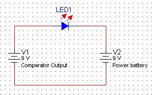 For the further analysis, let us consider the output of the op amp just as a voltage source. Along with a power source circuit, and the LED (Light Emitting Diode) they form a circuit which highs up in case when a current flows through the circuit.
