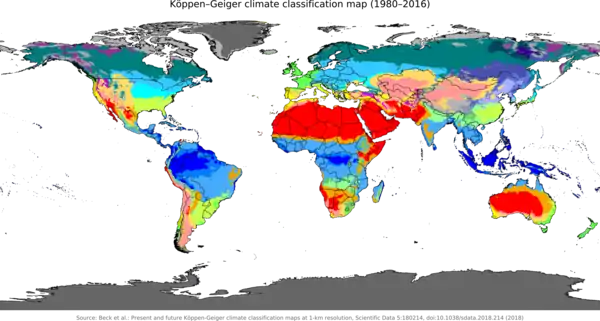 - ↑ Beck, Hylke E.; Zimmermann, Niklaus E.; McVicar, Tim R.; Vergopolan, Noemi; Berg, Alexis; Wood, Eric F. (30 October 2018). "Present and future Köppen-Geiger climate classification maps at 1-km resolution". Scientific Data 5: 180214. doi:10.1038/sdata.2018.214. ISSN 2052-4463. PMID 30375988. PMC 6207062. https://www.nature.com/articles/sdata2018214.