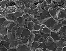 Crystal formation begins with a step-by-step assembly process called nucleation where self-organization forms a new structure. Crystal growth then proceeds to increase the particle size to form a highly organized crystalline region called a grain or crystallite. In a polycrystalline material, such as most metals, grains are randomly oriented and grain boundaries form wherever one grain meets another. The grains and grain boundaries are apparent in the image on the right.