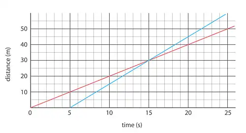 - You should be able to understand why the red line is drawn where it is - it starts at distance zero at time zero, and its slope must be 2 m/s. Mom's line (blue) starts 5 s later and has a slope of 3. The two meet at approximate time 15 s after Johnny starts, and distance 30 m. Graphical solutions are always approximate.