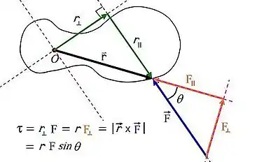 - is the torque caused by a force, F, exerted at a distance ,r, from the axis. The angle between r and F is θ.