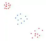Next, draw a series of dots in the centre in colour A, and a group of colour B dots in the upper right and lower left hand corners. If you only have one colour, different shapes can be used. Now, like before, attempt to draw a single straight line to separate the two.