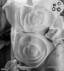 The frozen droplets on the surface of rimed crystals are hard to resolve and the topography of a graupel particle is not easy to record with a light microscope because of the limited resolution and depth of field in the instrument. However, observations of snow crystals with a low-temperature scanning electron microscope (LT-SEM) clearly show cloud droplets measuring up to 50 μm (0.00197 in) on the surface of the crystals. The rime has been observed on all four basic forms of snow crystals, including plates, dendrites, columns and needles. As the riming process continues, the mass of frozen, accumulated cloud droplets obscures the identity of the original snow crystal, thereby giving rise to a graupel particle.