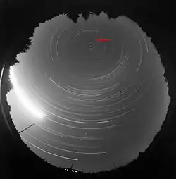 The Červená hora image was especially valuable. It recorded the fireball's trajectory over approximately 110°, starting 51° above the southern horizon, passing the zenith just 1° westward and disappearing only 19° above the northern horizon (thus crossing about 60% of the sky). Its camera was also equipped with a rotating shutter that interrupted the exposure 12.5 times per second and divided the captured track of the fireball, allowing the determination of its speed. Over the last 4°, the fireball's angular velocity was lower than the resolution of the instrument.[55] The Svratouch image recorded the trajectory only for about 15°, beginning at 30° above the northwest horizon, and the pictured fireball was quite weak. Despite this, the data was sufficient for the calculations.[55]