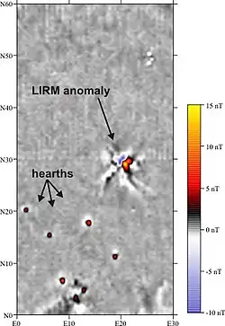 Lightning-induced magnetic anomalies can be mapped in the ground,[18][19] and analysis of magnetized materials can confirm lightning was the source of the magnetization[20] and provide an estimate of the peak current of the lightning discharge.[21]
