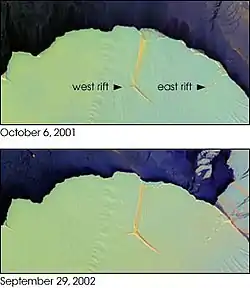 - ↑ R. B. Alley (2008). "A simple law for ice-shelf calving". Science 322 (5906): 1344. doi:10.1126/science.1162543. http://www.igsoc.org/journal/60/222/t14J010.pdf. Retrieved 2014-11-02.