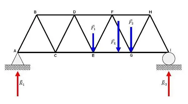 If the truss shown here were to need analysis for the internal forces on one particular member, EF, the method of sections could be used.  Here we use the previous values for   and  .  Also assume that each member is  meters long.