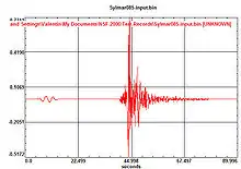 Seismogram of Sylmar085 earthquake in fractions of gravity acceleration, UCSD.