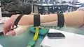 10. Attach two more straps positioned over the wrist and at the proximal end of device. Loop tape is attached via adhesive hook tape on the volar side of device. Straps 1 and 2 are attached as far as possible distally and proximally respectively.