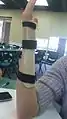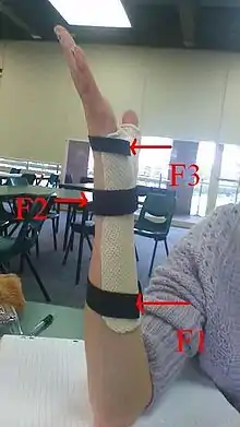3 straps are included on the dorsal surface of the device to apply a 3 point force system to maintain position. The straps are attached at the proximal end, over the wrist and at the distal end of device. The proximal and distal straps are placed as far as possible proximally and distally respectively. This allows for a longer lever arm, decreasing the necessary force to keep forearm/hand in required position. Figure 1 and 2 illustrate the positioning of the straps.