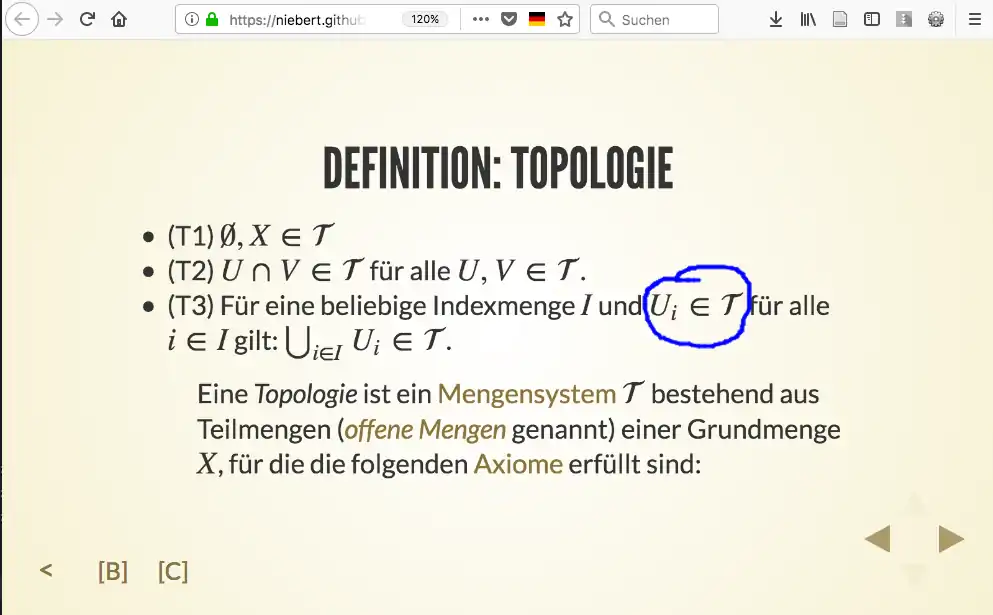 - (Wiki2Reveal Example) Start example Wiki2Reveal presentation generated on-the-fly from the german Wikiversity lecture in Mathematics. Click though the slides and press "C" for some slides to create comments on the slide. Furthermore test a some pages the blackboard by pressing "B" and write on the seperate blackboard for each slide. Press reload for the Wiki2Reveal presentation and see that the annotation and handwriting on the slides persist only for the browser session and are not stored on a server (privacy for annotations).