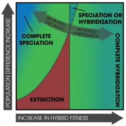 Speciation by reinforcement relies directly on selection to favor an increase in pre-zygotic isolation,[1] and the nature of selection's role in reinforcement has been widely discussed, with models applying varying approaches.[27] Selection acting on hybrids can occur in several different ways. All hybrids produced may be equality low-fitness,[21] conferring a broad disadvantage. In other cases, selection may favor multiple and varying phenotypes[24] such as in the case of a mosaic hybrid zone.[29] Natural selection can act on specific alleles both directly or indirectly.[27][20][32] Under direct selection, the alleles causing increased premating isolation diverge because they directly affect viability; the evolution of premating isolation in this case can mimic reinforcement but is arguably a different process. In cases where an allele is indirectly selected, its frequency increases due to linkage disequilibrium; this is the case under more standard concepts of reinforcement.[14] The condition of the hybrids under selection can play a role in post-zygotic isolation, as hybrid inviability and sterility prohibit gene flow between populations.[7] Selection against the hybrids can even be driven by any failure to obtain a mate, as it is effectively indistinguishable from sterility—each circumstance results in no offspring.[7]